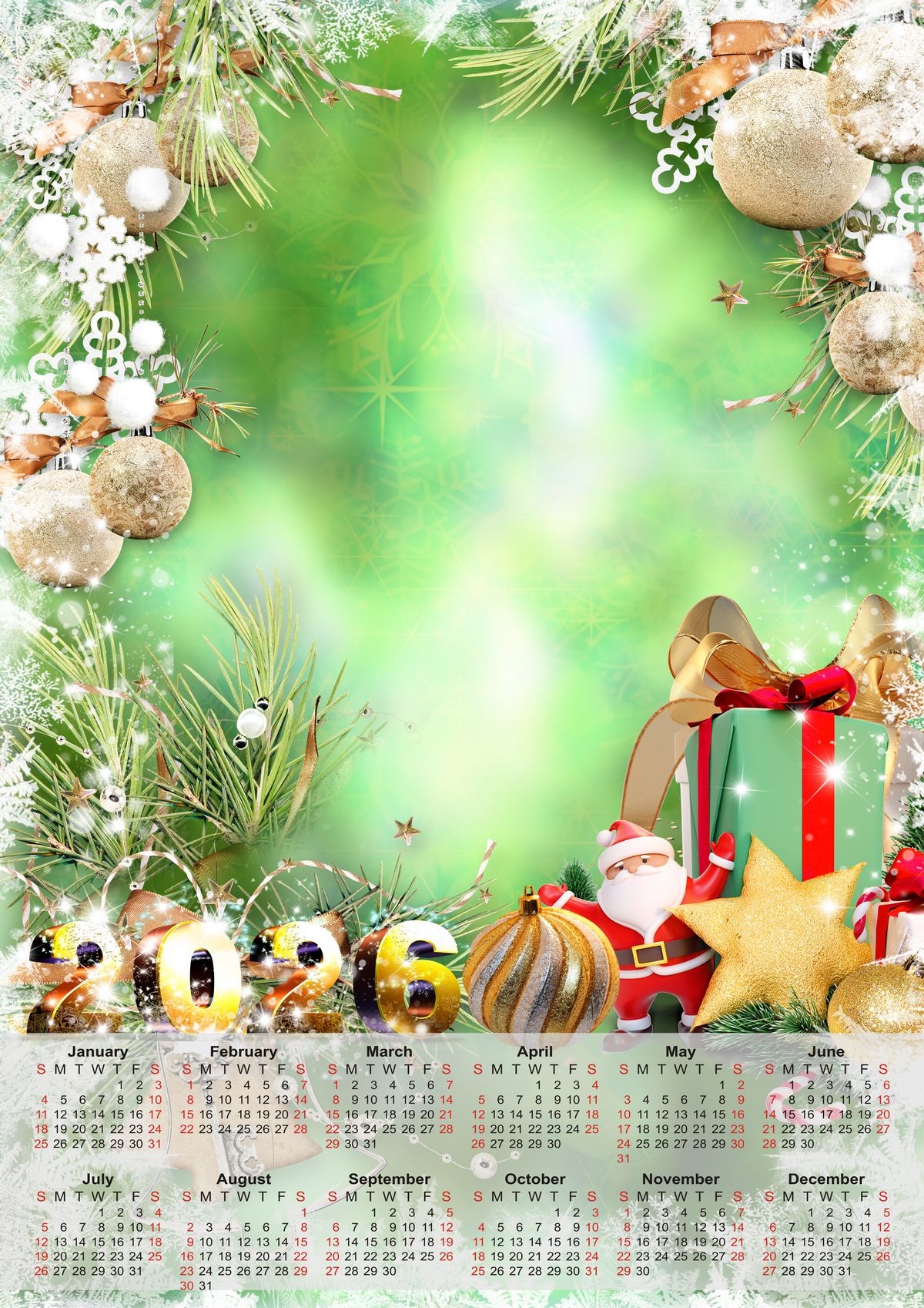2026 Calendar With Santa Claus And Gifts